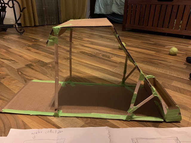 Hope you are doing well and staying healthy. This is XXX. I was wondering if you could review these designs. I made some changes to them after we talked last Wednesday. I drew the designs again and I made another prototype. I still need to finish some parts on the cardboard prototype but I wanted to get some feedback before I added more things on it. I added a rain collecting system using the roof and left some space for flat solar panels. I have been investigating types of material for shelters and tents and I think a good material to incorporate would be canvas but I am not sure how heavy it is and how much it costs. I also think that it would be good to add waterproof material on the outside and reflective material. I would really appreciate it if you could look over these designs and give me some feedback.